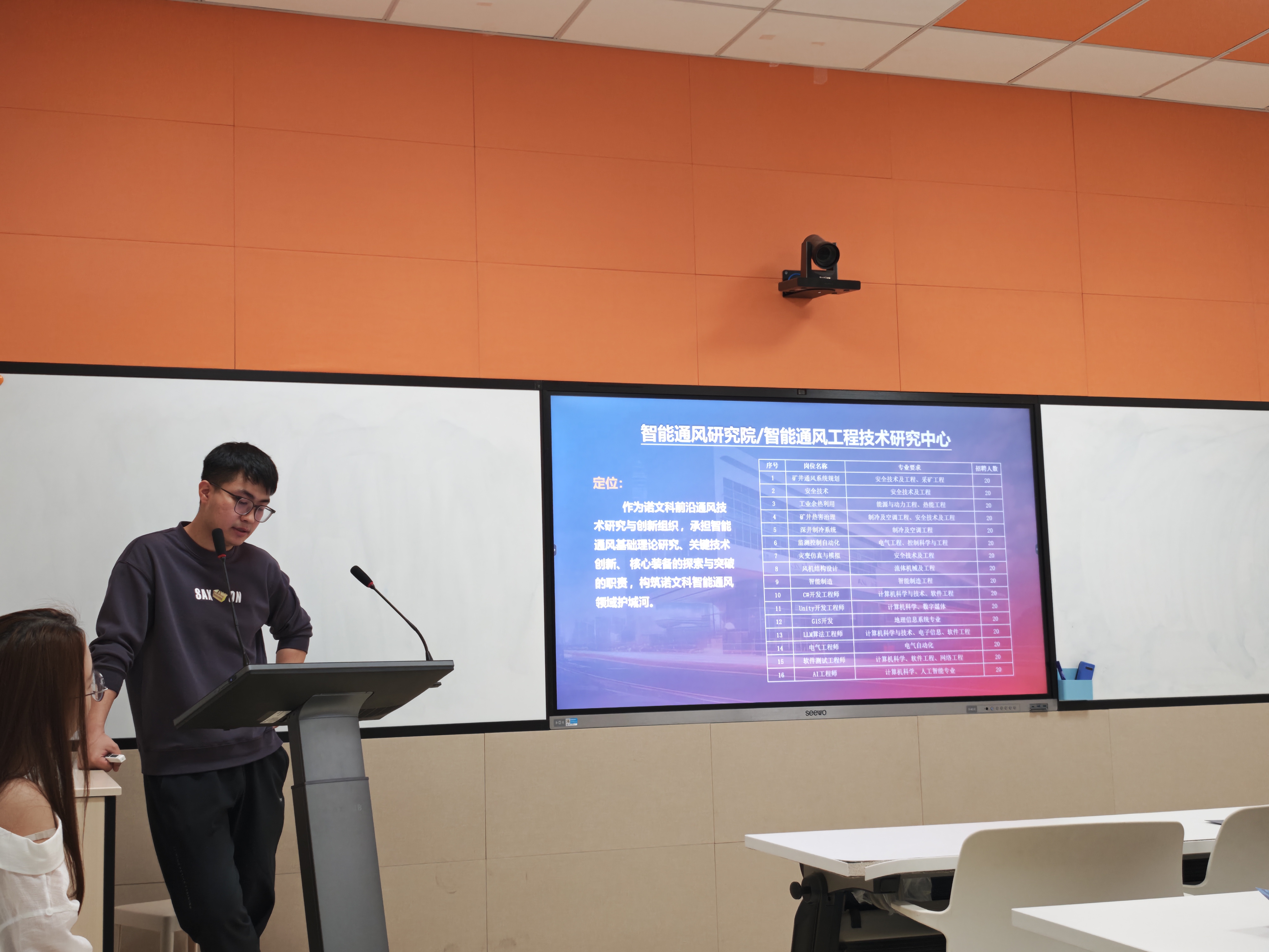 宣讲活动伊始,能环学院对诺文科一行的到来表示热烈欢迎,并简要介绍了本次宣讲会的流程和安排。随后,诺文科的招聘负责人详细介绍了公司的基本情况。诺文科成立于2018年10月,注册资本5800万元,作为诺文科集团旗下专注智能通风系统研究和应用的专业研究机构,公司始终致力于智能通风领域的研究与成果应用。其智能通风系统由六大子系统构成,包括智能主通风系统、智能局部通风系统、智能风门风窗系统、智能感知系统、智能应急疏散系统以及智能通风管控平台。诺文科倡导并践行“动调+变频”模式的智能主通风系统,通过自研核心算法,实现对井下管网各处通风阻力及风门风窗开度的实时解算,确保智能主通风系统在任意工况下均运行在相对最高效区域。