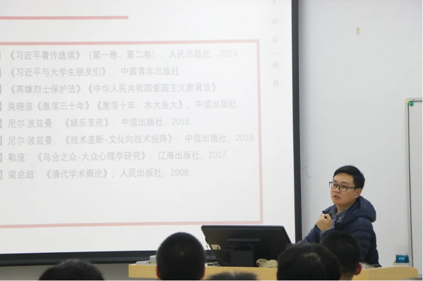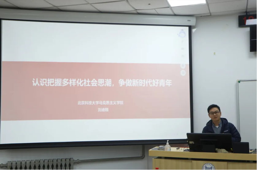 刘迪翔以近期与社会思潮相关的热点事件及近期思想理论动态为引,切入团校第一讲的主题——大学生与社会思潮。他由浅入深,用幽默风趣的语言介绍了与大学生相关的社会思潮和影响大学生主要的社会思潮,与学员们讨论作为大学生应该如何正确认识社会思潮,向团校学员们讲授了正确、科学对待社会思潮以及其他问题的方式。最后,他强调了本次讲座中的多对辩证关系,希望同学们具备批判性思维,能够辨别、理解、正确对待社会思潮,保持正确的价值观,并为同学们推荐学习书籍,鼓励同学们持续学习。