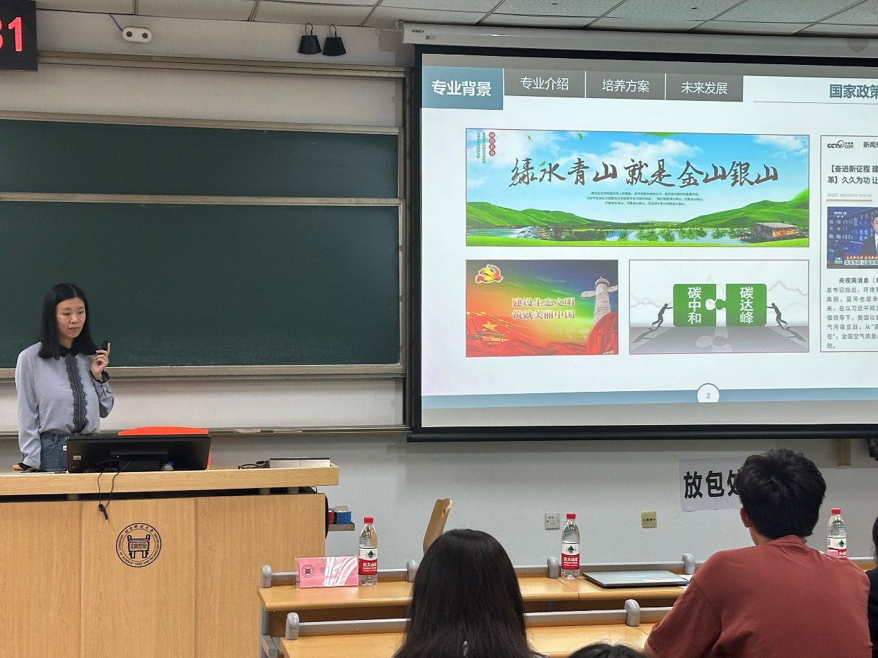 袁蓉芳通过专业背景、专业介绍、培养方案、未来发展四个方面对环境科学和环境工程两个专业进行讲解。她表示环境专业学位国际含金量高、学科综合实力强、师资力量雄厚,是国家“211工程”、“国家优势学科创新平台”重点学科,国家级特色专业建设点。最后袁蓉芳以“环境人一直在努力”做结,启发同学们对未来发展方向的思考,表达了对同学们的期盼与鼓励。