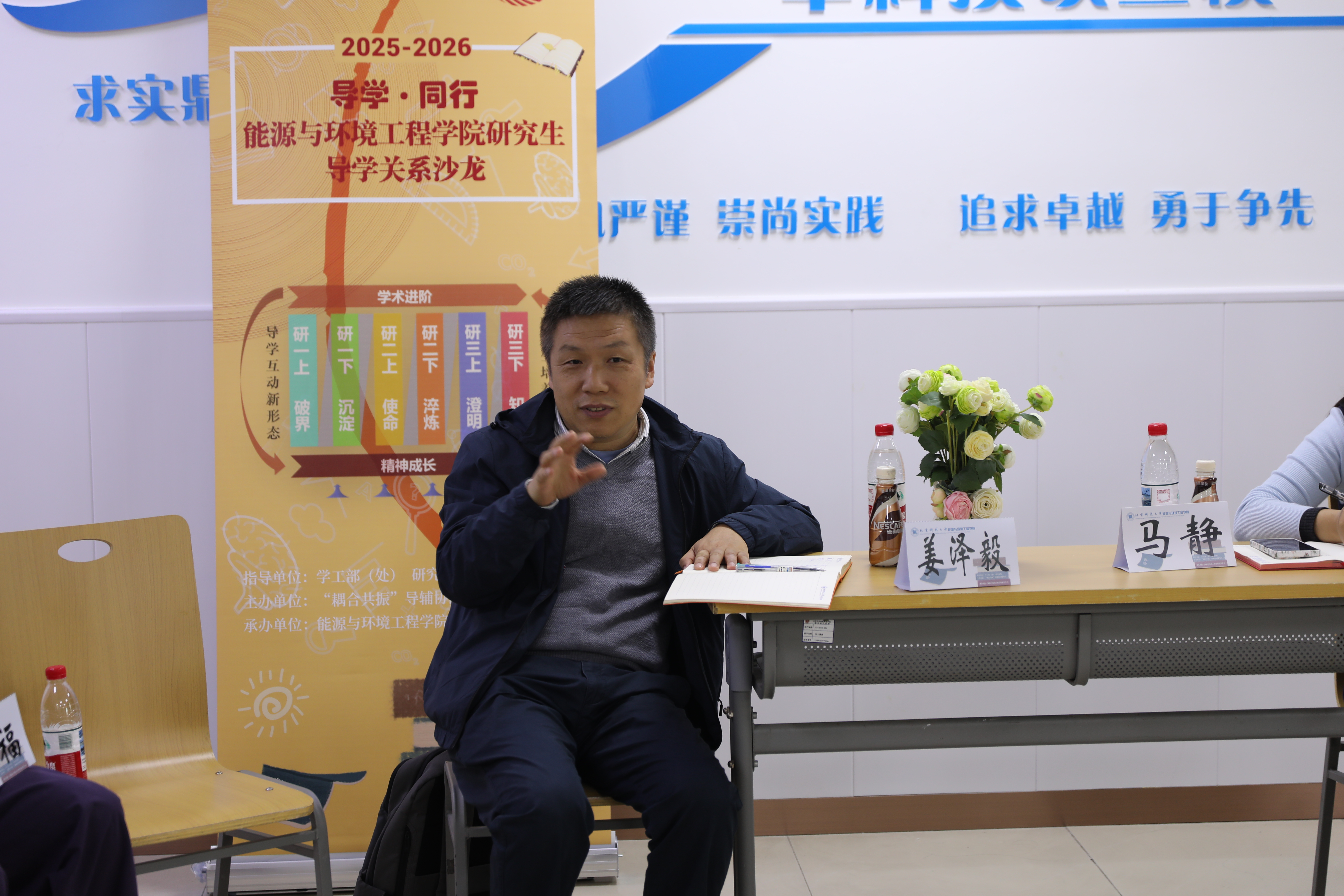 随后进入“导师眼里的导学关系”访谈环节。姜老师结合多年指导经验,就新生常见的认知误区、研究生应具备的核心素养、如何主动管理导师期望等问题进行了深入浅出的解答。他指出,导学关系本质上是“亦师亦友”的协作关系,学生应保持“真诚”的态度,勇于沟通、主动担当,并以“我喜欢”“我愿意”“我希望”三个关键词概括了理想的学生状态。姜老师强调:“始于清晰的目标,成于定期的沟通,立于主动的担当,终于动态的平衡”,鼓励大家在科研道路上主动出击,赢得尊重与成长空间。