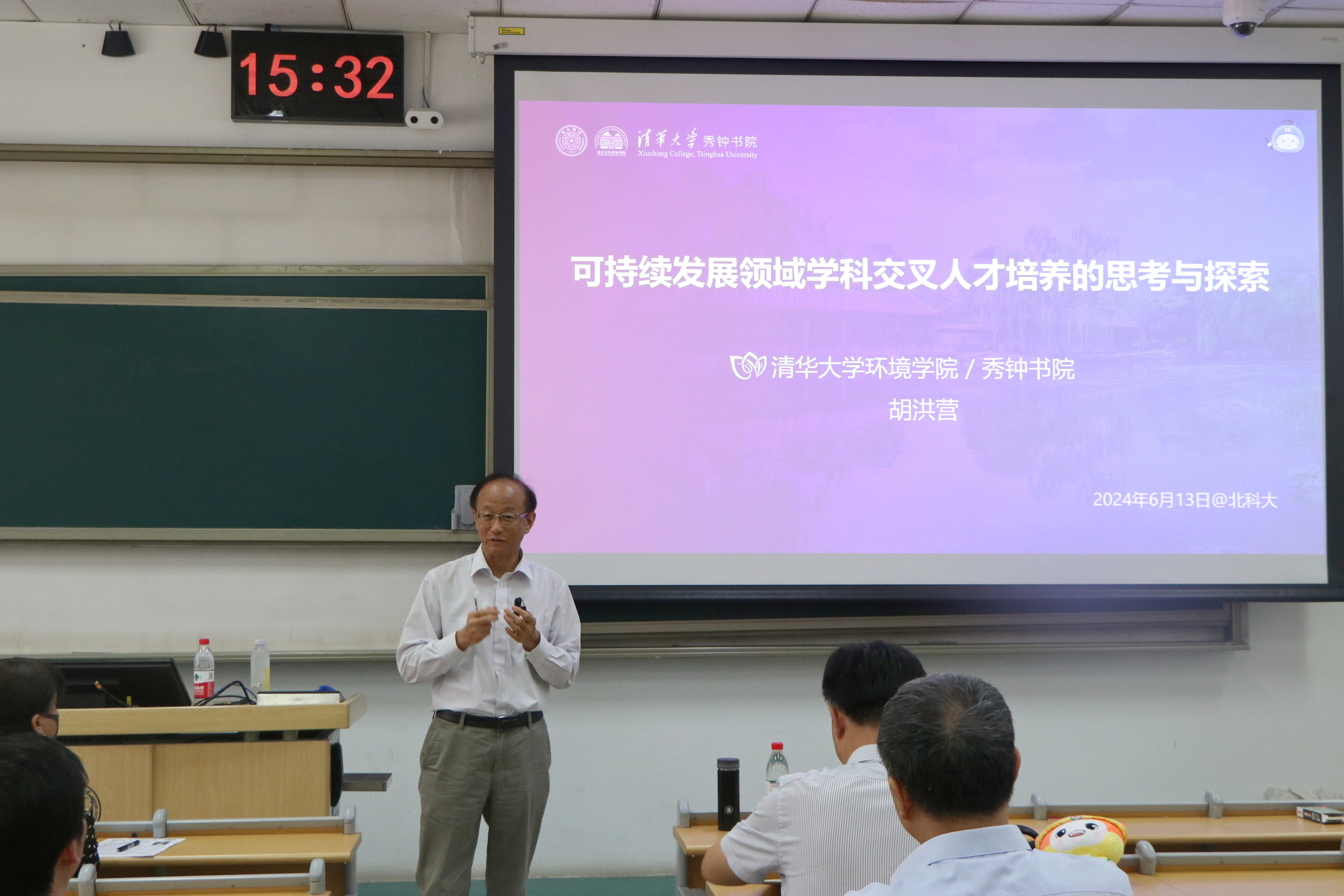 胡洪营以“可持续发展领域学科交叉人才培养的思考与探索”为主题开展专题讲座。他从我国生态环境事业发展与战略转变的角度出发,介绍了我国社会经济发展和生态环境保护取得的历史性成就,深入剖析了我国环境学科的任务与未来使命,详细阐述了可持续发展人才培养的发展趋势、基础性问题、战略性挑战和未来教育模式。他指出,人才是推动可持续发展的核心力量,而高等教育是实现可持续发展目标的基础支柱,应积极打破学科壁垒,加强跨学科交流与合作,培养具备多学科知识背景和创新能力的人才,充分发挥可持续发展“推动者”与“引擎”的重要作用。随后,胡洪营从发展历程、培养目标和方向、共建合作单位、育人理念、课程体系、培养方案等方面系统性地介绍了清华大学秀钟书院。他表示,可持续发展是一种理念,更是一个复杂系统工程和伟大实践,需要创新当前大学教育模式,积极探索学科交叉、跨界协同,努力培养深层次技术、多边形人才,赋予学生行稳致远的能力。