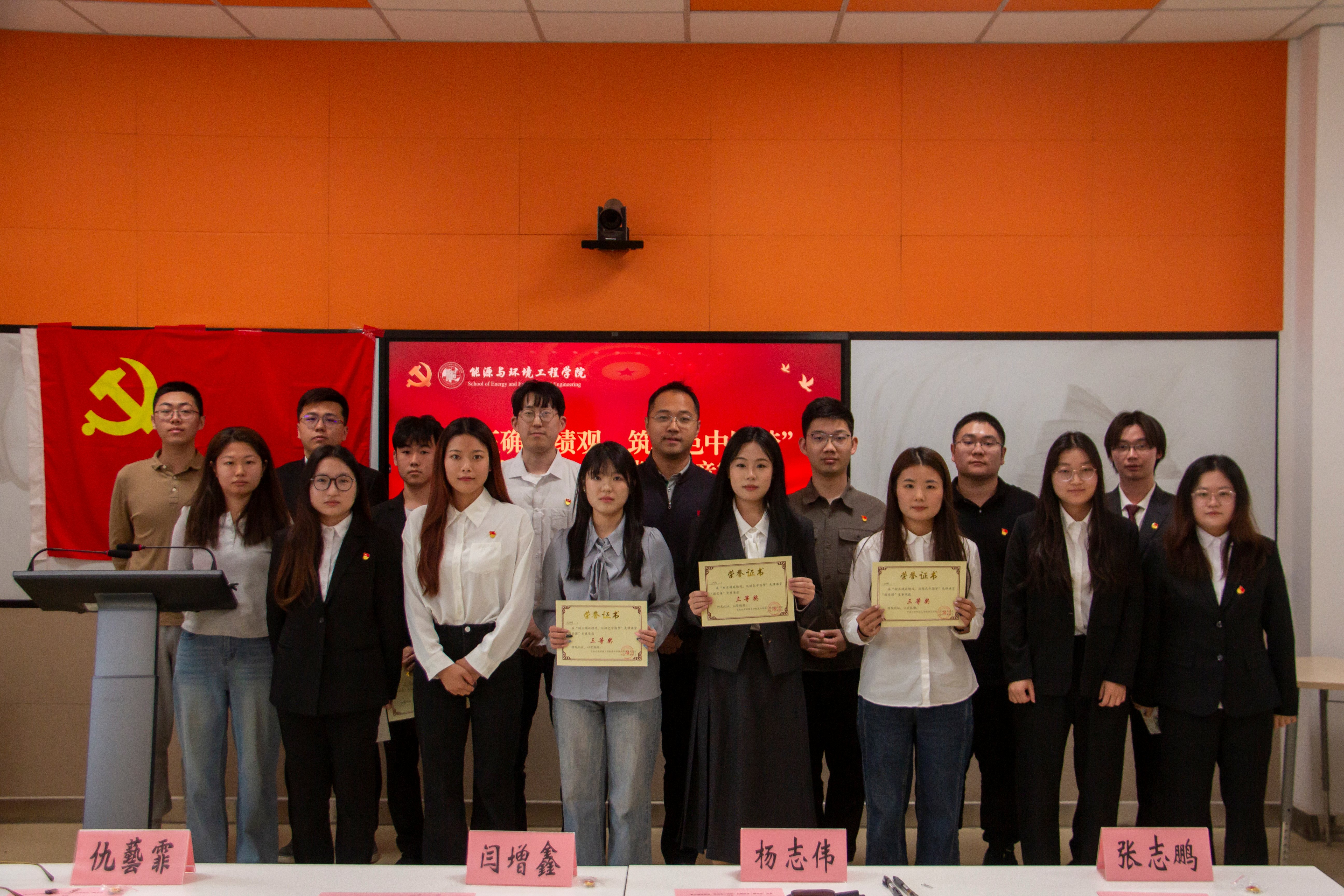 经过激烈的角逐,最终在本次“树正确政绩观,筑绿色中国梦”先锋课堂“微党课”竞赛中,丁淑萍获得一等奖,吴宇洋、陆渤霖获得二等奖,王可喜、白琳、赵伊婷获得三等奖。杨志伟为获奖同学颁发证书。