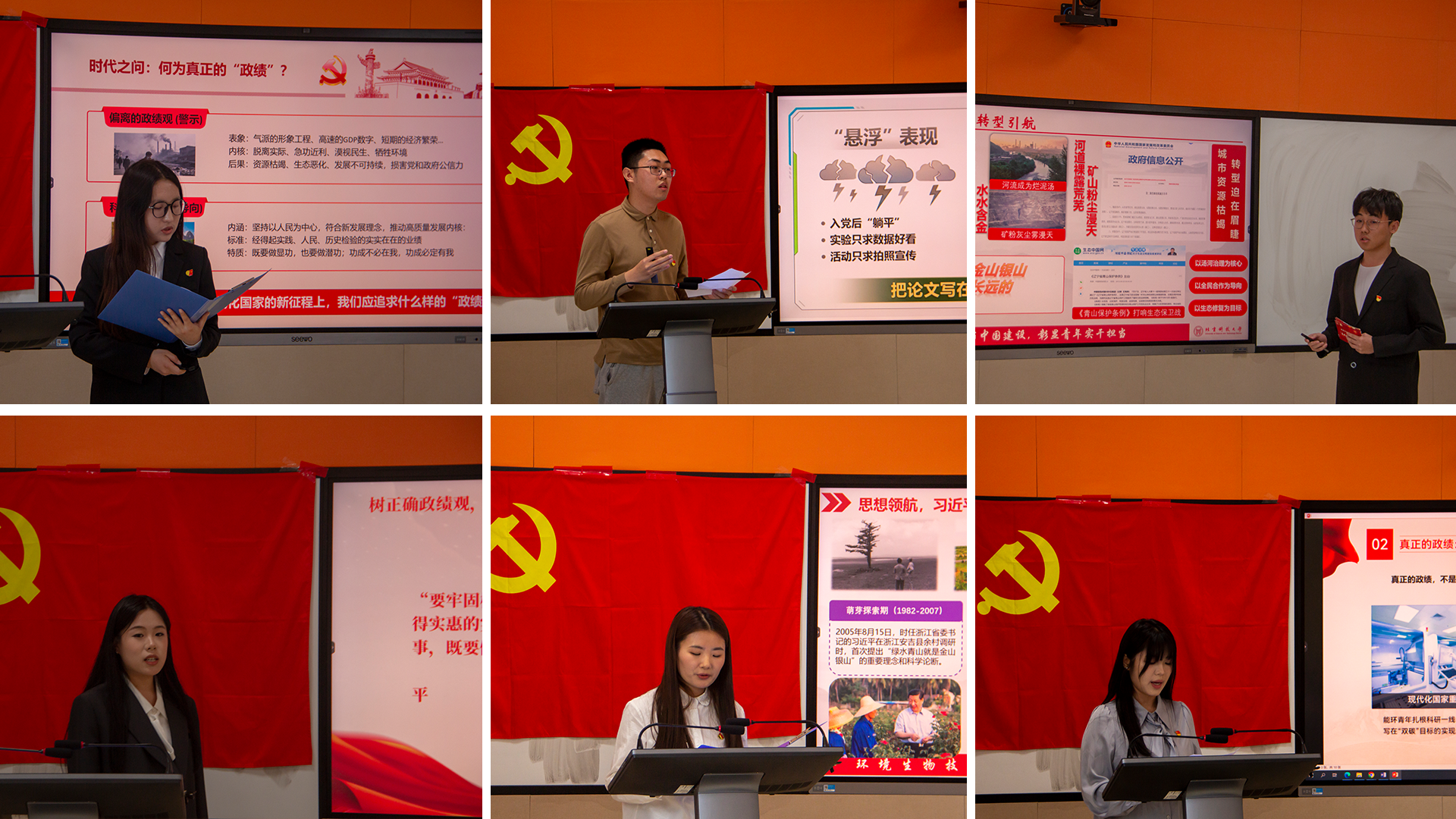 本次活动分为党支部自评和学院评比两个环节。经过各学生党支部自评推荐和学院初审等环节,最终14名学生党员进入先锋课堂“微党课”竞赛决赛。决赛中 14 名学生党员紧扣 "树正确政绩观,筑绿色中国梦" 主题,结合专业与实践,从反对形式主义、坚守实干担当、践行 "两山" 理念、融入 "双碳" 战略、潜心科研攻关、守护生态环境等角度,深入阐释正确政绩观内涵,呼吁将个人理想融入国家绿色发展与美丽中国建设。
