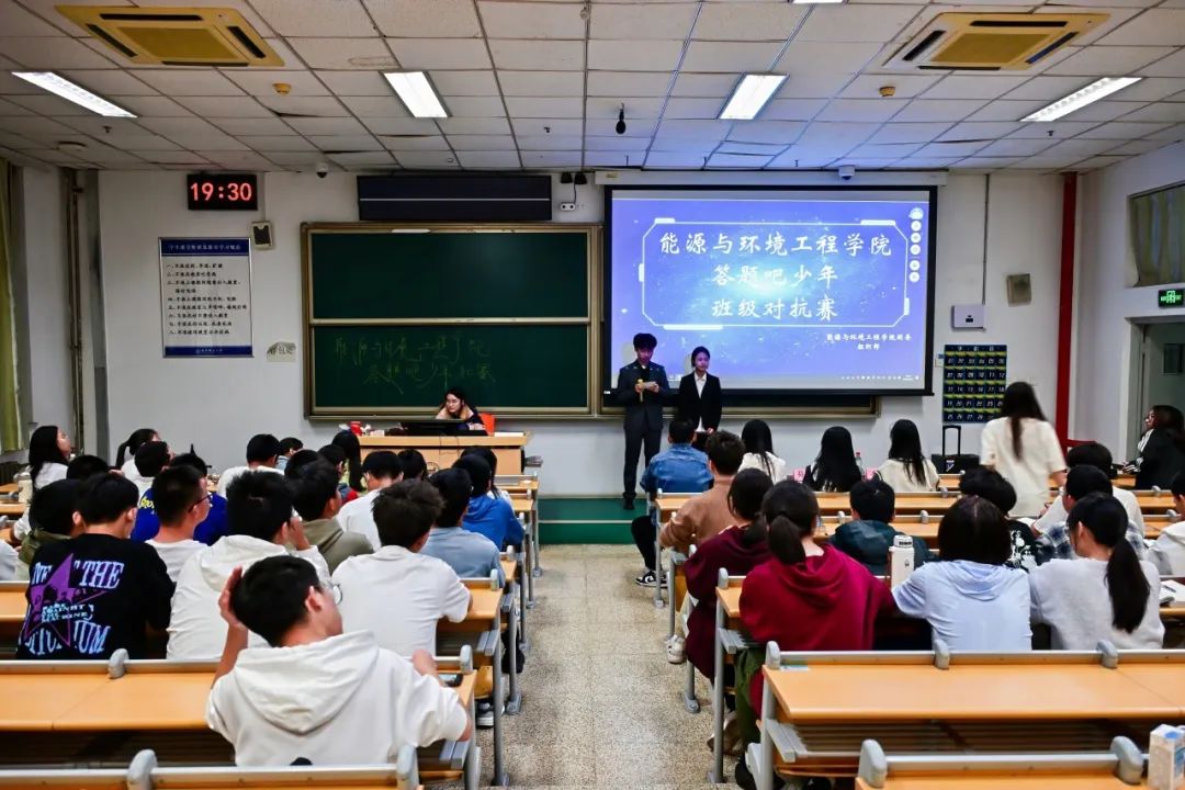 “答题吧少年”百科知识争霸赛能环分站赛赛程分为“智在必得”“互动问答”“突出重围”三个环节,每班派出四名同学代表班级参赛。题目内容包括校史、传统文学、体育、地理、党史国情、法律、信息技术、安全、自然科学、文旅十个大类。现场气氛热烈、高潮迭起,选手们摩拳擦掌,争相竞答,角逐冠军。