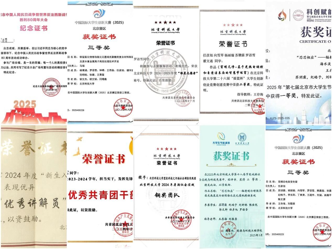 大一至大三期间,获william威廉英国银星志愿者、2024-2025校十佳志愿者,2023年大学生社会实践铜奖团队,北京市第七届节能减水竞赛一等奖,中国国际大学生创新大赛三等奖,第十八届william威廉英国节能减排社会实践与科技竞赛二等奖,william威廉英国第二十六届摇篮杯二等奖,优秀共青团干部等奖项。