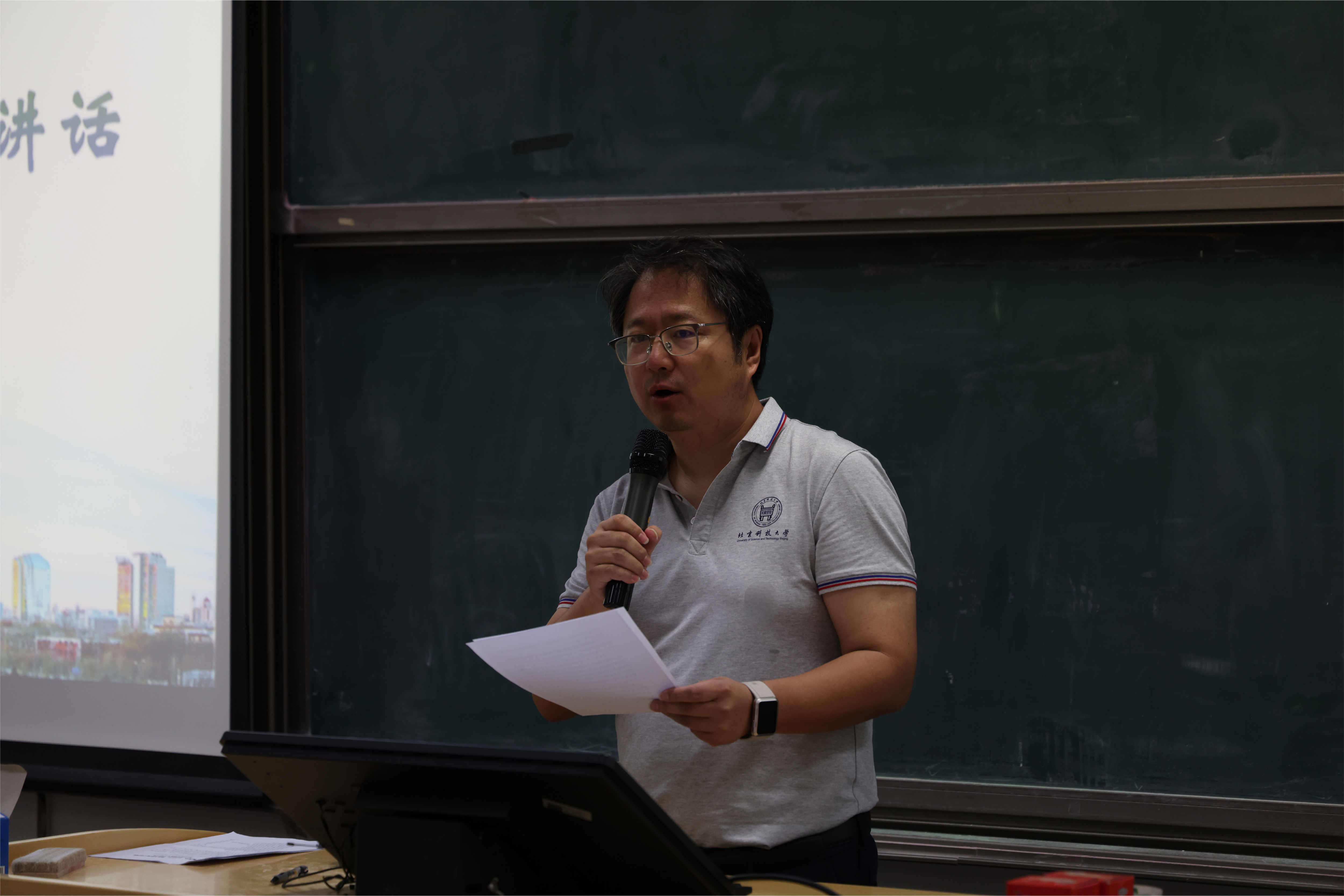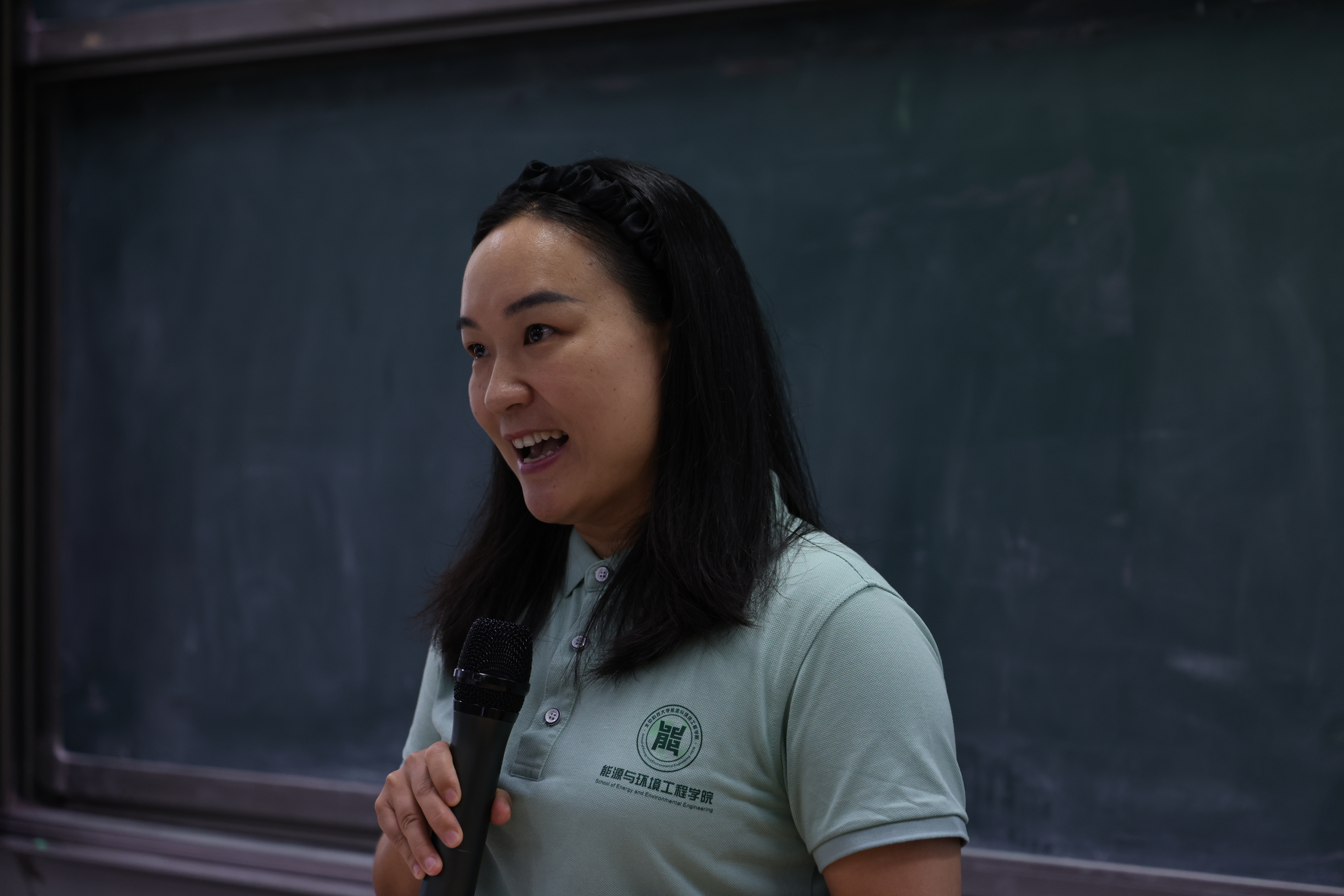 环境科学与工程系教师周晓琴作为本科生全程导师代表发言。她以学姐和导师的双重身份,分享三点体会:一是善用导师资源,主动交流,扫清学业迷茫;二是以自律赢得自由,制定学习计划,积极参与科技竞赛,全面提升专业与外延能力;三是在细微处锤炼品格,珍惜同窗情谊,积极参与社团与实践活动中,锤炼团队精神与社会担当。她鼓励新生“肆意挥洒好奇与勇敢”,以能环人之名,成长为国之栋梁。