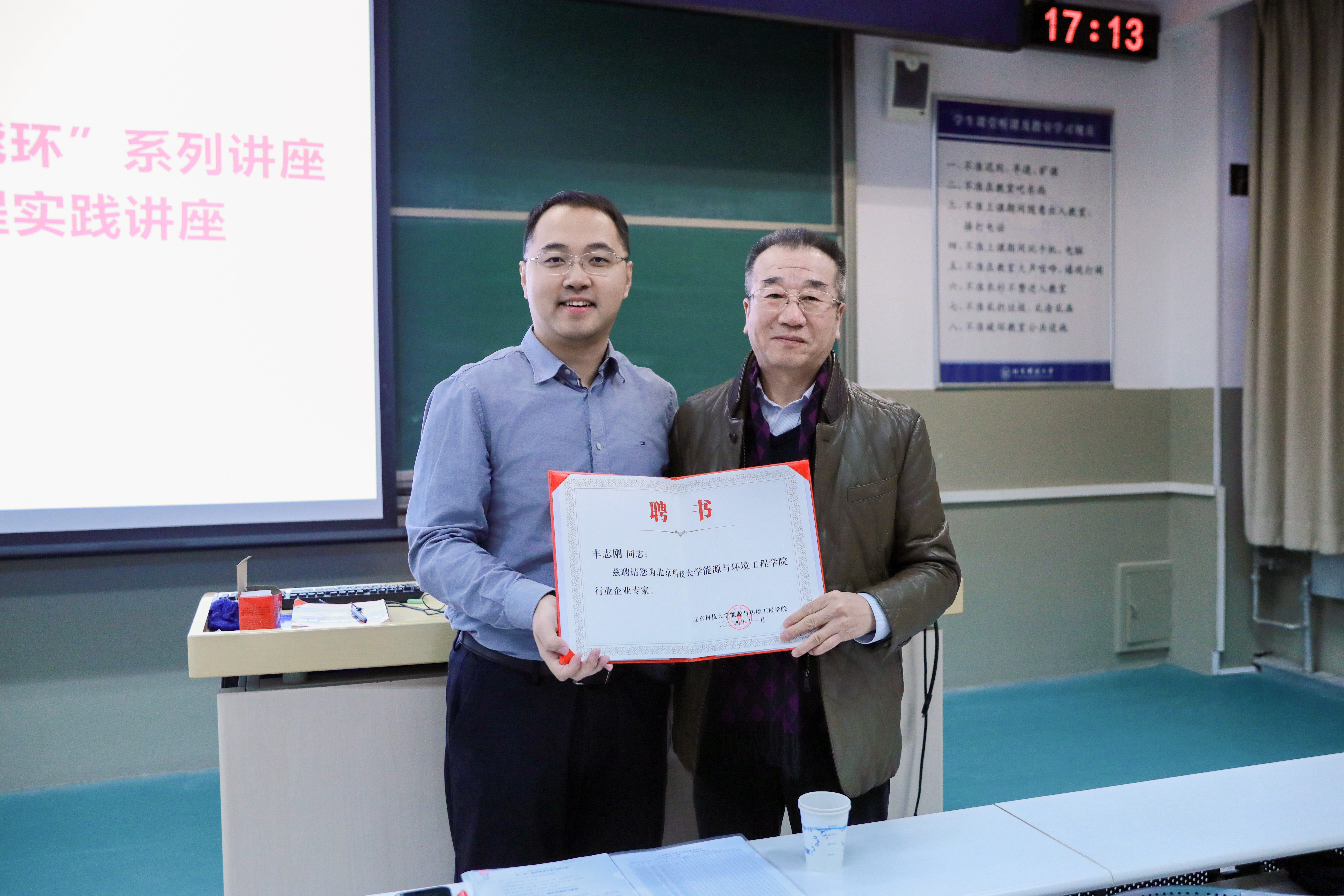 讲座伊始,杨志伟为丰志刚颁发学院行业企业专家聘书。