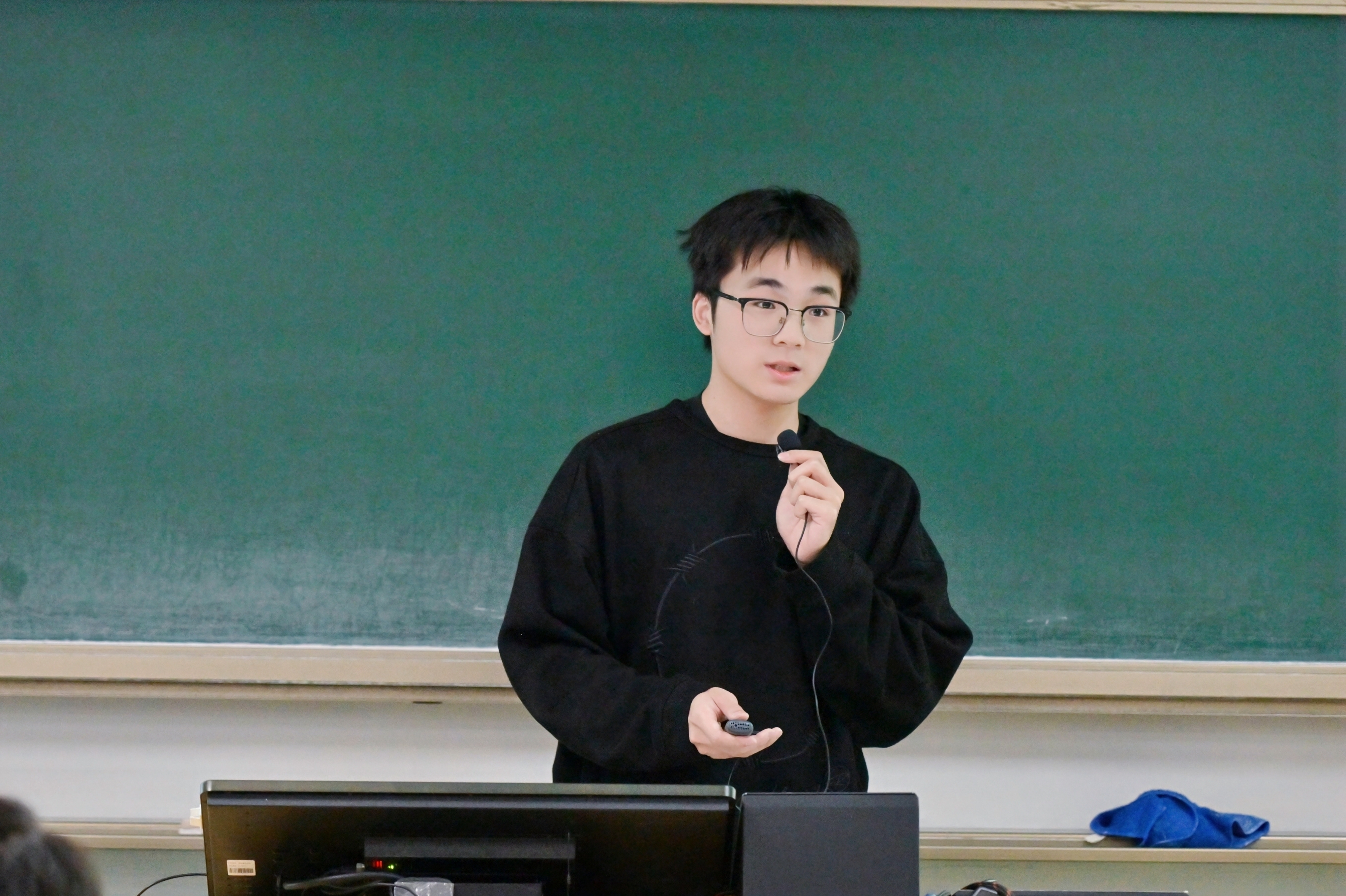 2022级本科生钟雪松以科研竞赛为主题,从学院特色、竞赛介绍以及如何准备竞赛等方面分享了他的科研竞赛经验。他鼓励新生学好专业知识,遇到问题积极与导师沟通,做事情要有勇于克服困难的勇气。