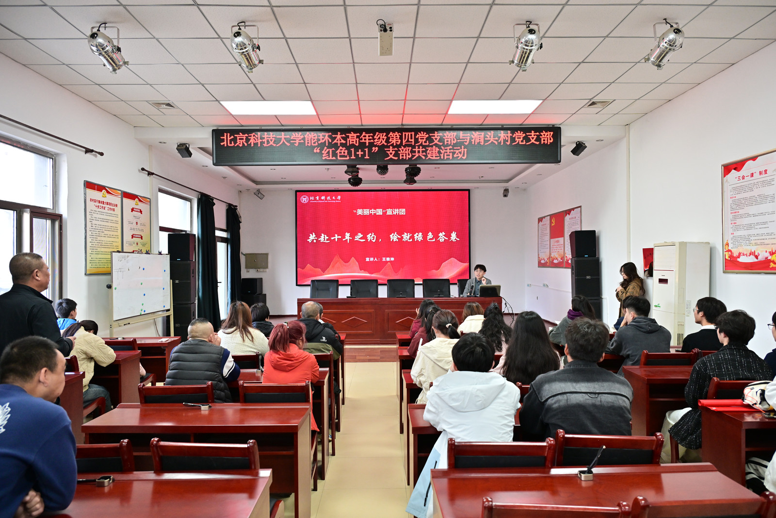 在“主题宣讲”环节,能环学院“美丽中国”宣讲团成员王雅珅就“共赴十年之约,绘就绿色答卷”,讲述了“一带一路”倡议下生态文明建设的璀璨成就;侯宛廷以“‘两大’发展理念引领乡村振兴”为题,阐述学院科技创新与绿色发展引领乡村生态文明发展的生动实践;杨博玮围绕 “秉青春之笔,绘盎然‘绿’意”主题进行宣讲,号召为推进美丽中国建设贡献力量。宣讲现场气氛热烈,掌声不断,宣讲内容激发了在场每一位党员和村民对环境保护的深刻思考。