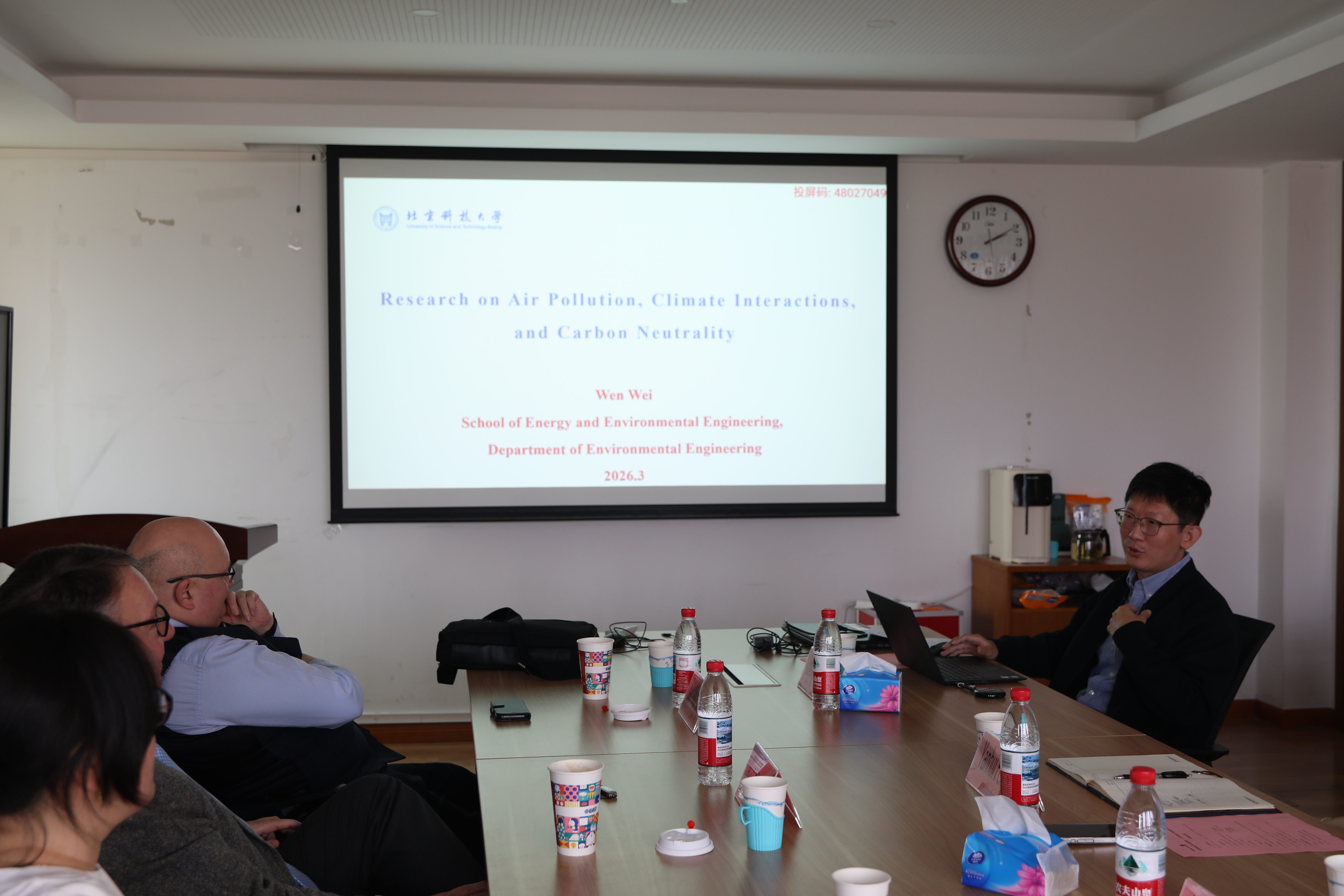 座谈伊始,冯妍卉对艾伦·海伍德教授一行的到访表示热烈欢迎,介绍了与会人员。张玲玲教授简要介绍了北科大能环学院的发展底蕴与学科优势介绍了环境科学与工程系在环境监测、污染治理、环境健康、环境材料等领域的研究基础,以及在相关领域的国际合作和学生培养工作。温维副教授详细介绍了北科大在PM₂.₅与臭氧的协同控制,气溶胶辐射相互作用及其对气候变化影响研究。