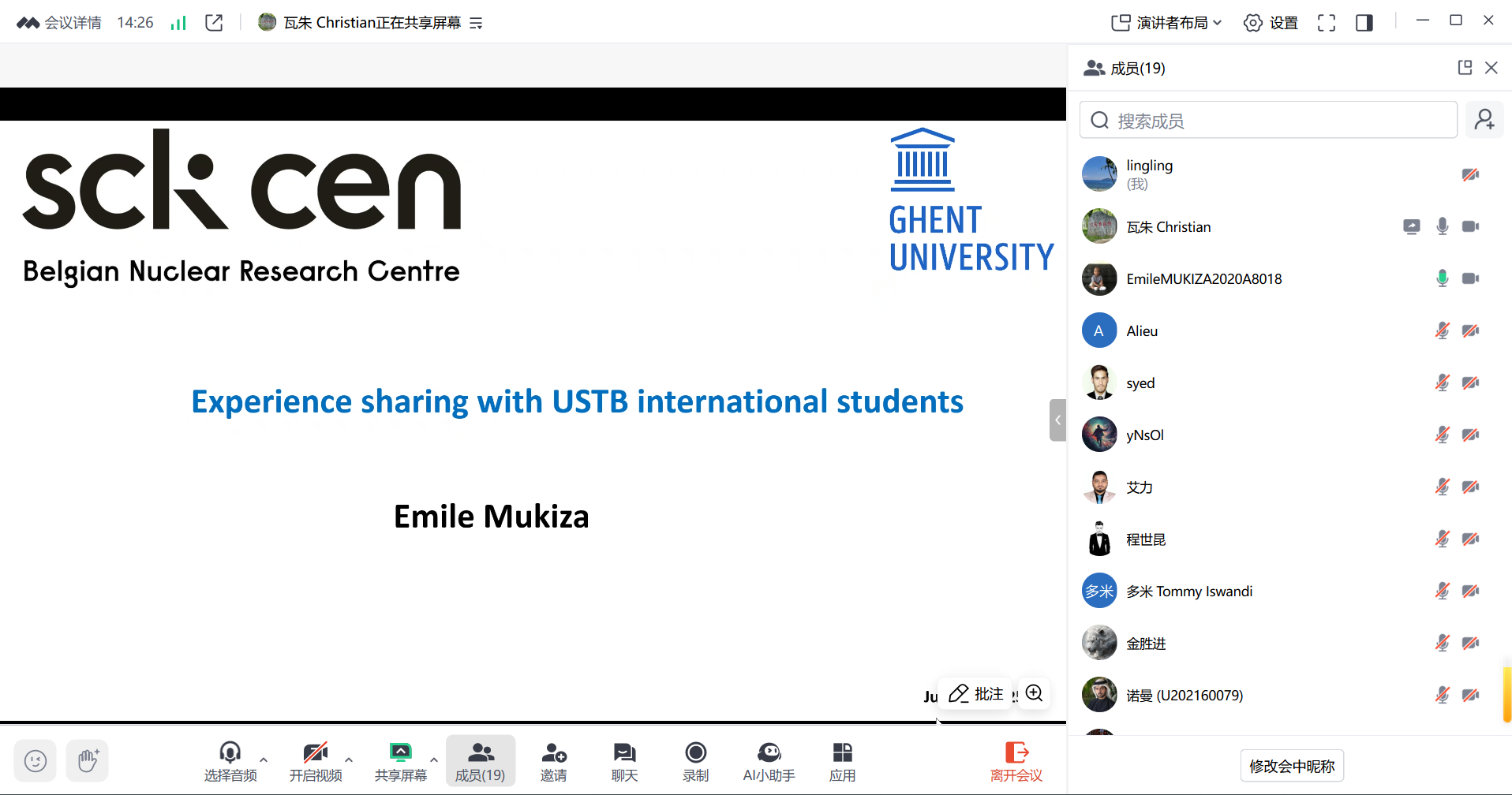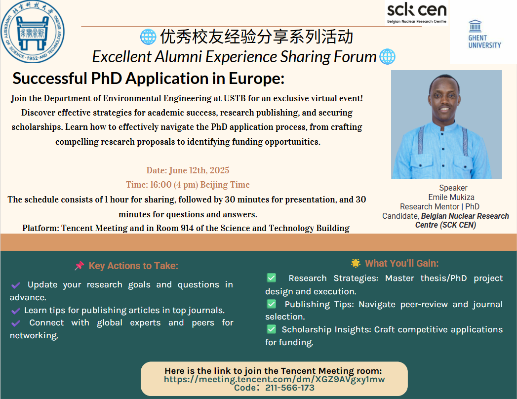 本次分享会邀请了2019届来自卢旺达的来华硕士留学生Emile Mukiza(中文名:米勒,硕士期间导师:张玲玲教授,现就读于比利时核研究中心Belgian nuclear research center)重磅回归,为来华留学们带来关于博士申请策略与博士阶段学习的深度解读与实用经验。分享会参与人员不仅有环境科学与工程系在读硕士和本科生,还有来自资安学院和经管学院的来华留学生。